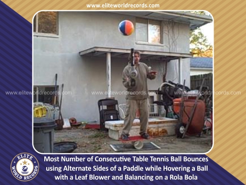 Most Number of Consecutive Table Tennis Ball Bounces using Alternate Sides of a Paddle while Hovering a Ball with a Leaf Blower and Balancing on a Rola Bola