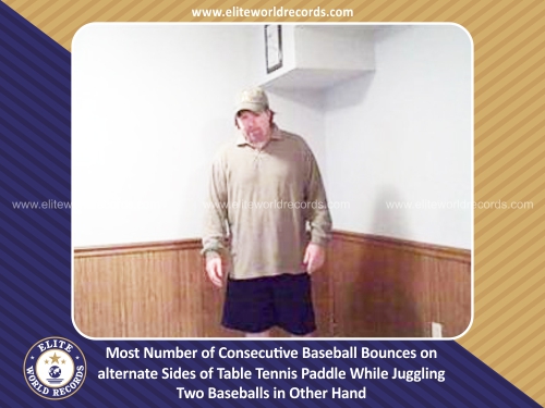 Most Number of Consecutive Baseball Bounces on alternate Sides of Table Tennis Paddle While Juggling Two Baseballs in Other Hand