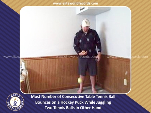 Most Number of Consecutive Table Tennis Ball Bounces on a Hockey Puck While Juggling Two Tennis Balls in Other Hand