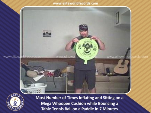 Most Number of Times Inflating and Sitting on a Mega Whoopee Cushion while Bouncing a Table Tennis Ball on a Paddle in 7 Minutes