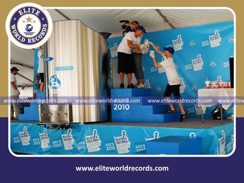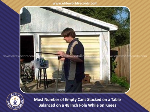 Most Number of Empty Cans Stacked on a Table Balanced on a 48 Inch Pole While on Knees