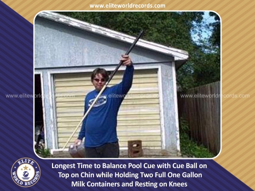 Longest Time to Balance Pool Cue with Cue Ball on Top on Chin while Holding Two Full One Gallon Milk Containers and Resting on Knees