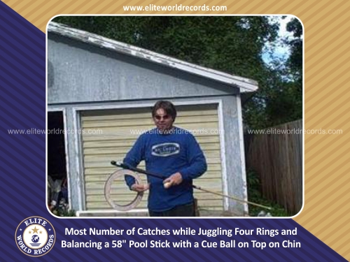 Most Number of Catches while Juggling Four Rings and Balancing a 58" Pool Stick with a Cue Ball on Top on Chin