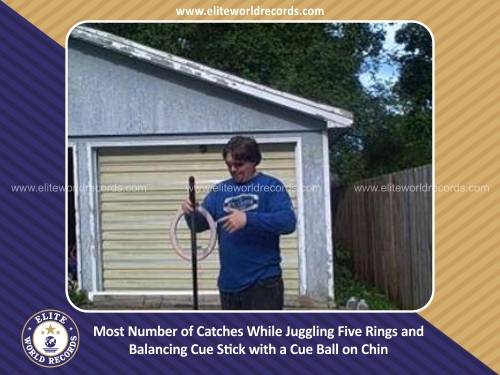 Most Number of Catches While Juggling Five Rings and Balancing Cue Stick with a Cue Ball on Chin