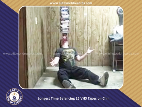 Longest Time Balancing 25 VHS Tapes on Chin
