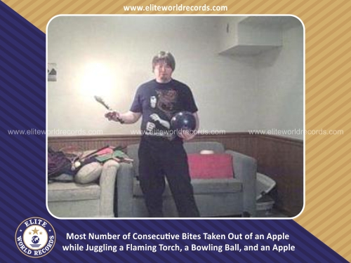 Most Number of Consecutive Bites Taken Out of an Apple while Juggling a Flaming Torch, a Bowling Ball, and an Apple