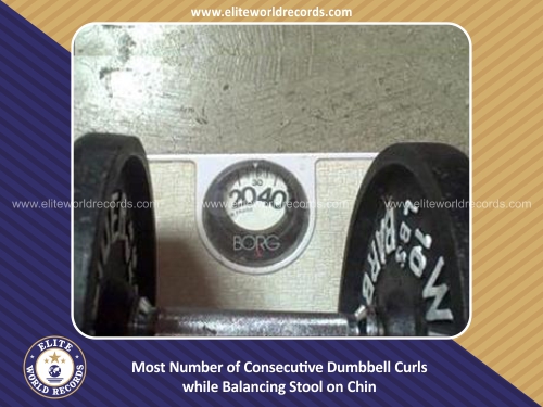Most Number of Consecutive Dumbbell Curls while Balancing Stool on Chin