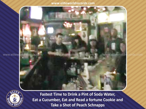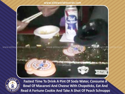 Fastest Time To Drink A Pint Of Soda Water, Consume A Bowl Of Macaroni And Cheese With Chopsticks, Eat And Read A Fortune Cookie And Take A Shot Of Peach Schnapps