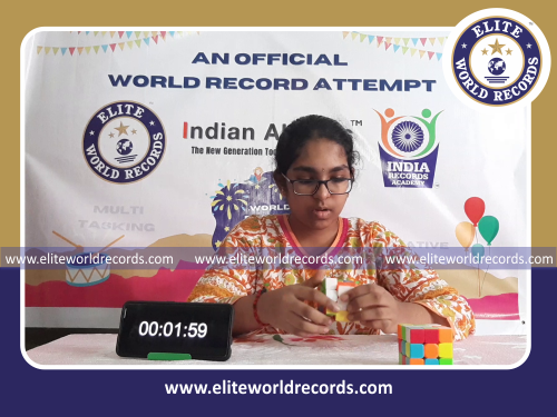 The Fastest Time to Solve 25 Two Digit Mental Arithmetic Multiplication Problems (2 Rows) while solving Rubik Cubes Simultaneously by an Individual (Female) clocked to 2 minutes 43 seconds was set by Sudeeptaa Naravula, Student of Indian Abacus Private Limited, in Ambattur, Chennai District, Tamil Nadu, India on August 14, 2021.