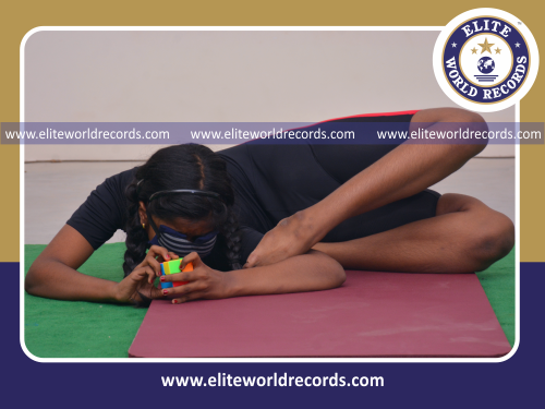 The Fastest Time to Solve a Rubik Cube (2 x 2) while Holding Kapotasana Yoga Pose Blindfolded by an Individual (Female) clocked to 28 seconds, was set by Prisha Karthikeyan at Meena Sankar Vidyalaya, Tirunelveli District, Tamil Nadu, India on July 7, 2021.