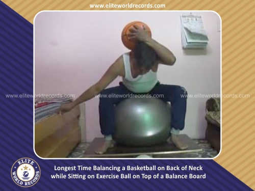 The Longest Time Balancing a Basketball on Back of Neck while Sitting on Exercise Ball on Top of a Balance Board lasted for 1 minute and 22.17 seconds was set by Suresh Gaur at Gwalior, Madhya Pradesh, India on April 10, 2015.