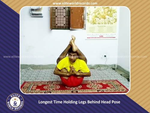 The Longest Time Holding Legs Behind Head Pose lasted for 5 minutes and 7 seconds was set by Krishan Kumar at New Delhi , India on June 21, 2017.