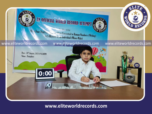 The Most Four Digit Cardinal Numbers Converted to Roman Numbers (Writing) in 5 Minutes by an Individual (Minor-Male) counted to 26 was set by M.Adhvik, in Bangalore District, Karnataka, India on August 28, 2021.