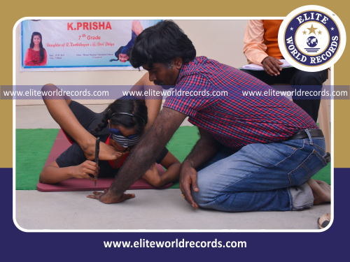The Most Knife Stabs Performed Between Fingers of Another Person while Holding Viparitha Kanda Perundasana Blindfolded by an Individual (Female) in 30 Seconds counted to 69 stabs, was set by Prisha Karthikeyan at Meena Sankar Vidyalaya, Tirunelveli District, Tamil Nadu, India on July 7, 2021.