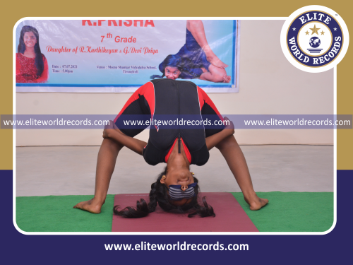 The Most Niralamba Poorna Chakrasana Yoga Pose Performed Blindfolded by an Individual (Female) in One Minute counted to 28, was set by Prisha Karthikeyan at Meena Sankar Vidyalaya, Tirunelveli District, Tamil Nadu, India on July 7, 2021.