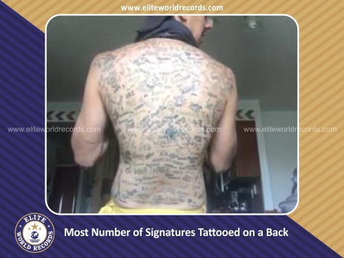 The Most Number of Signatures Tattooed on a Back counted to 190 was set by Funky Matas at Miami Springs, Florida, United States on August 10, 2017.