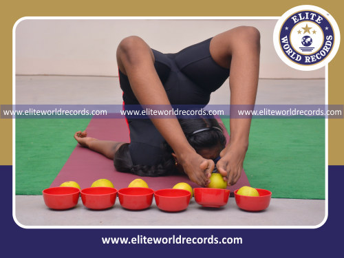 The Most Oranges placed in a Bowl using Legs while Holding Viparita Salabhasana Yoga Pose Blindfolded by an Individual (Female) in One Minute counted to 13 oranges, was set by Prisha Karthikeyan at Meena Sankar Vidyalaya, Tirunelveli District, Tamil Nadu, India on July 7, 2021.