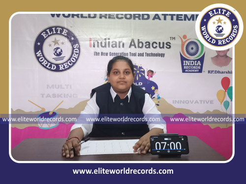 The Most Single Digit Mental Arithmetic Addition Problems (5 Rows) Solved in 7 Minutes by an Individual (Female) counted to 120 was set by R.P.Dharshini, Student of Indian Abacus Private Limited, in Chennai District, Tamil Nadu, India on August 28, 2021.