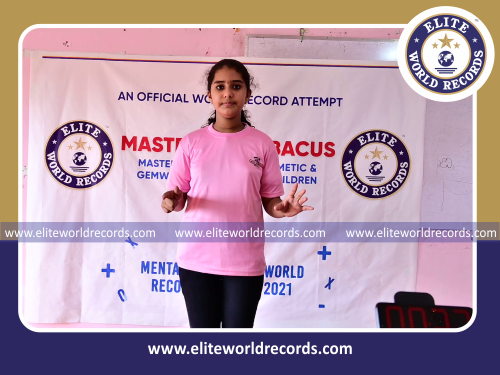 The Fastest Time to Solve 100 Two Digit Mental Arithmetic Addition and Subtraction Problems (2 Rows) by an Individual (Female) clocked to 4 minutes 17 seconds, was set by S.Veda, Student of Master Kids Abacus, in Thaliparamba, Kannur District, Kerala, India on September 29, 2021.