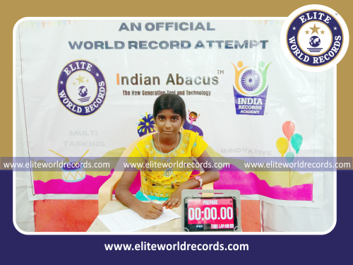 The Fastest Time to Solve 100 Two Digit Mental Arithmetic Addition Problems (3 Rows) by an Individual (Female) clocked to 6 minutes 47 seconds, was set by R.Reshma, Student of Indian Abacus Private Limited, in Thiruthangal, Virudhunagar District, Tamil Nadu, India on October 27, 2021.