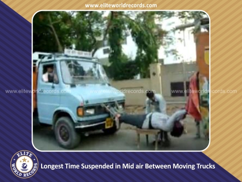 The Longest Time Suspended in Mid air Between Moving Trucks lasted for 34.57 seconds was set by Montystar Agarawal at Gurgaon, Haryana, India on July 16, 2009.